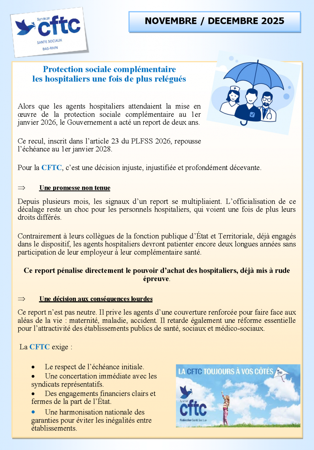 Tract du Syndicat CFTC Santé Sociaux des mois de novembre et décembre 2025 Accueil / Lettres d'informations / Télécharger le tract Partager :Cliquez pour partager sur Facebook(ouvre dans une nouvelle fenêtre)Cliquez pour partager sur Twitter(ouvre dans une nouvelle fenêtre)Cliquez pour partager sur LinkedIn(ouvre dans une nouvelle fenêtre)Cliquer pour imprimer(ouvre dans une nouvelle fenêtre)