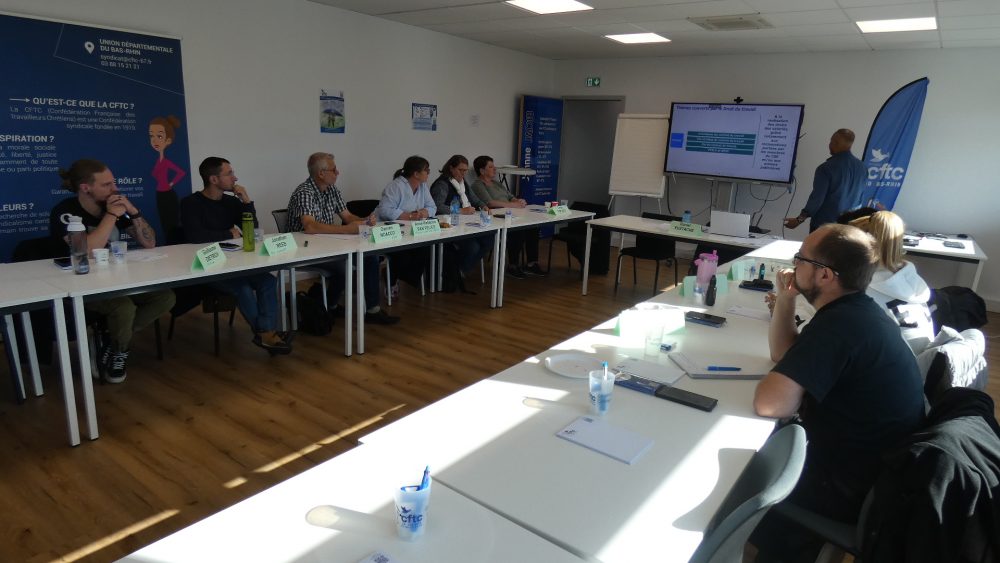 Photos de la formation CSE – de 50 salariés qui a lieu du 18 au 19 septembre 2025 à l’Union Départementale CFTC du Bas-Rhin Accueil / Actualités / Partager :Cliquez pour partager sur Facebook(ouvre dans une nouvelle fenêtre)Cliquez pour partager sur Twitter(ouvre dans une nouvelle fenêtre)Cliquez pour partager sur LinkedIn(ouvre dans une nouvelle fenêtre)Cliquer pour imprimer(ouvre dans une nouvelle fenêtre)